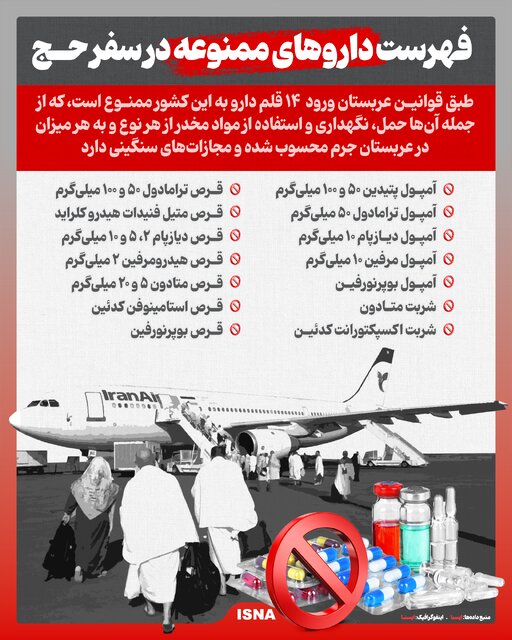 طبق قوانین عربستان ورود ۱۴ قلم دارو به این کشور ممنوع است، که از جمله آنها حمل، نگهداری و استفاده از مواد مخدر از هر نوع و به هر میزان در عربستان جرم محسوب شده و مجازاتهای سنگینی دارد.