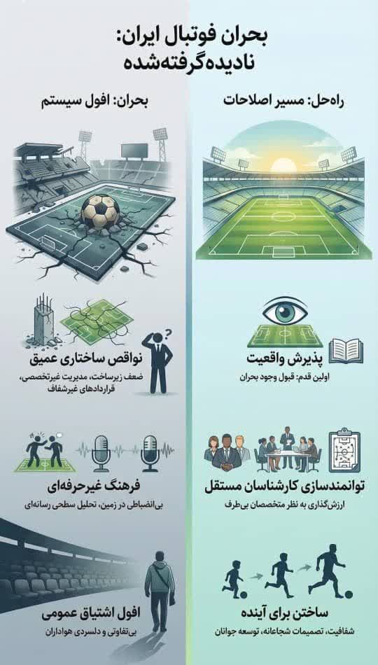 فوتبال ایران بیش از هر زمان دیگر به شفافیت، تصمیمهای شجاعانه و احترام به شعور مخاطب نیاز دارد. اصلاح این مسیر نه با هیجان و وعده ، بلکه با پذیرش واقعیت و تکیه بر تخصص ممکن است. اگر حقیقت پذیرفته شود، هنوز میتوان به بازگشت فوتبال به جایگاه واقعیاش امیدوار بود.