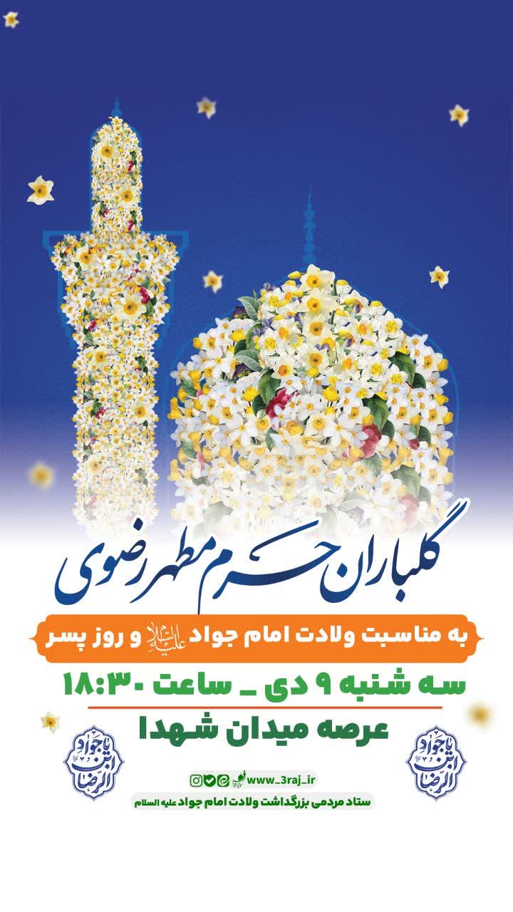 • گلباران حرم مطهر رضوی به مناسبت ولادت امام جواد (ع) سه شنبه 9 دی ماه در میدان شهدای مشهد برگزار می شود.