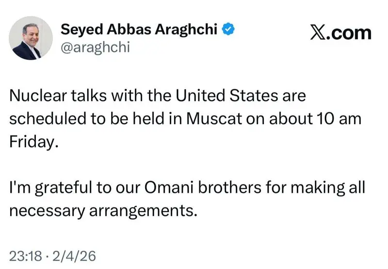 به گزارش نخست نیوز ،علیرغم خبرهایی که ساعاتی پیش در رسانههای خبری مبنی بر لغو مذاکرات ایران و آمریکا در روز جمعه منتشر شد، سید عباس عراقچی وزیر امور خارجه کشورمان با انتشار توئیتی نوشت: مذاکرات ساعت 10 صبح روز جمعه در مسقط برگزار خواهد شد:
